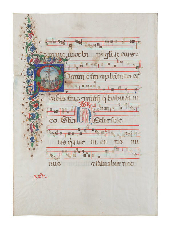 [ILLUMINATED MANUSCRIPTS]. Antiphonal leaf with large historiated initial “D” on verso depicting the Crucifixion with the Virgin Mary, St. John the Evangelist and St. Mary Magdalene at the foot of the Cross. [Italy, 15th century].