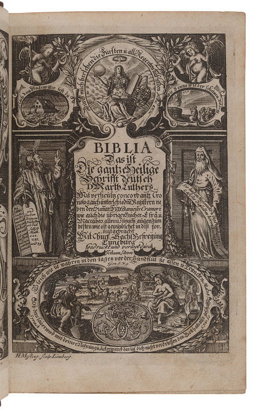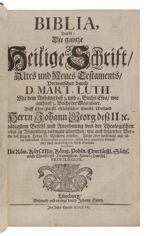 BIBLE, in German. Biblia, Das ist: Die gantze Heilige Schrift altes und neues Testaments verteutschet durch D. Mart. Luth. Lüneburg: Johann Stern, 1707.