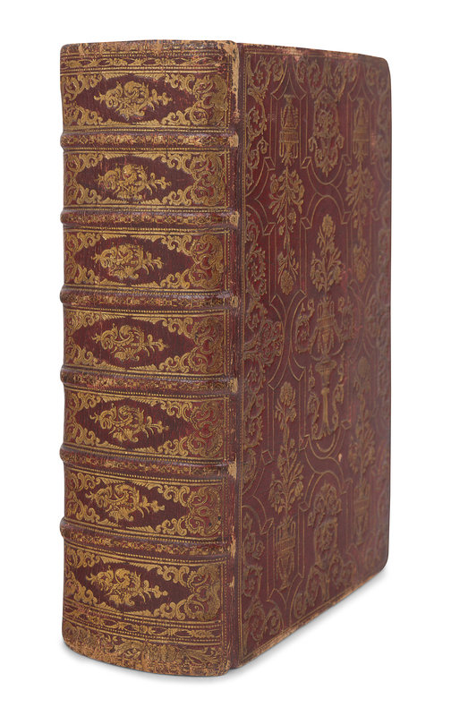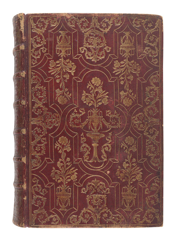 8vo (214 x 138 mm). Engraved frontispiece, title and 24 engraved plates. Contemporary German red morocco gilt, covers decorated in a baroque style with gilt foliate and floral borders incorporating an interlacing strapwork arabesque design forming a large central panel and four corner panels, each containing an elaborate gilt urn holding a large blooming floral motif; edges gilt and gauffered (some rubbing and minor wear to spine bands and board extremities).