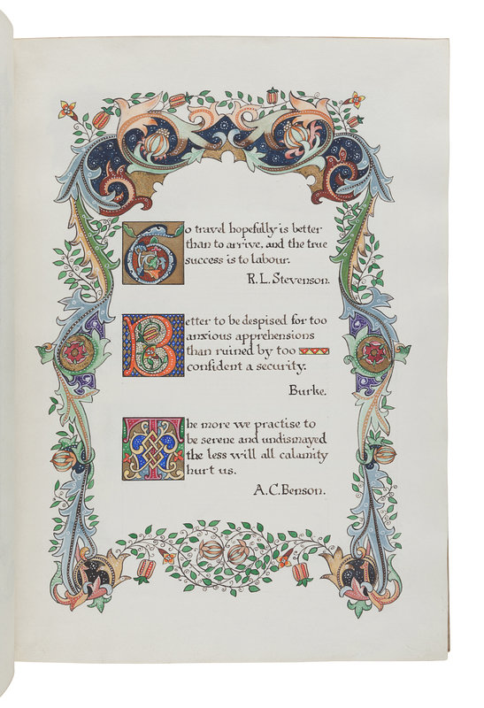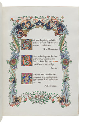 Including quotes and aphorisms by Cicero, Seneca, Epictetus, Stevenson, Thoreau, Shakespeare, Bacon, and numerous others, each with an illuminated initial, within wide illuminated borders.