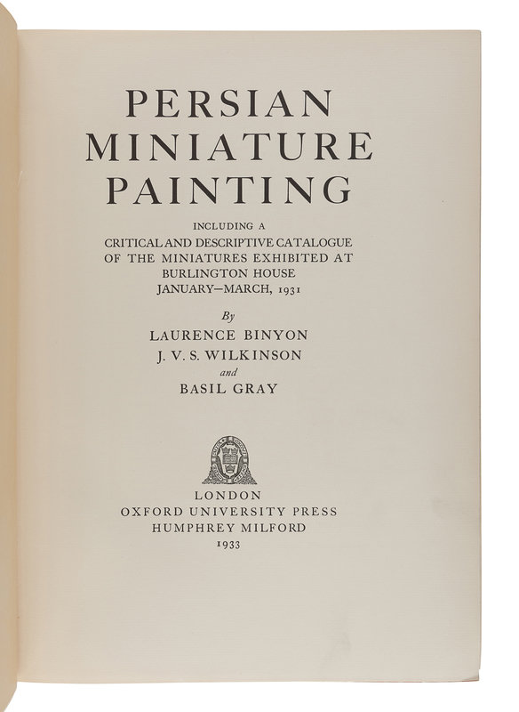 BINYON, Laurence (1869-1943). -- Wilkinson, James Vere Stewart (1885-1957). -- GRAY, Basil (1904-1989). Persian Miniature Painting. Including a Critical and Descriptive Catalogue of the Miniatures Exhibited at Burlington House January-March, 1931. London: Oxford University Press, Humphrey Milford, 1933. Folio. Frontispiece, 113 plates, a few in color. Original yellow-brown cloth stamped in gilt (very light rubbing to extremities). FIRST EDITION.