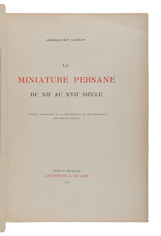 [MIDDLE EASTERN ART]. SAKISIAN, Arménag Bey (1875-1949). La Miniature Persane du XIIe au XVIIe Siècle. Paris and Brussels: Les Editions G. Van Oest, 1929.
