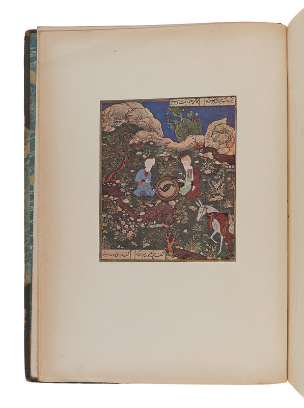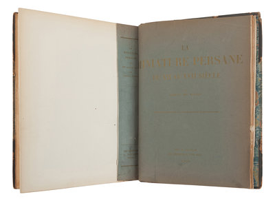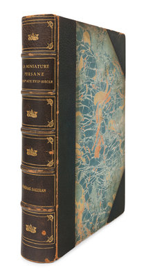 Folio. 106 plates (including 2 in color) of reproductions of 193 Persian miniatures. Half blue morocco gilt, top edge gilt (rubbing to extremities, slight soiling to bottom edge); original wrappers bound in. Provenance: M.L. Hermanos (bookplate).