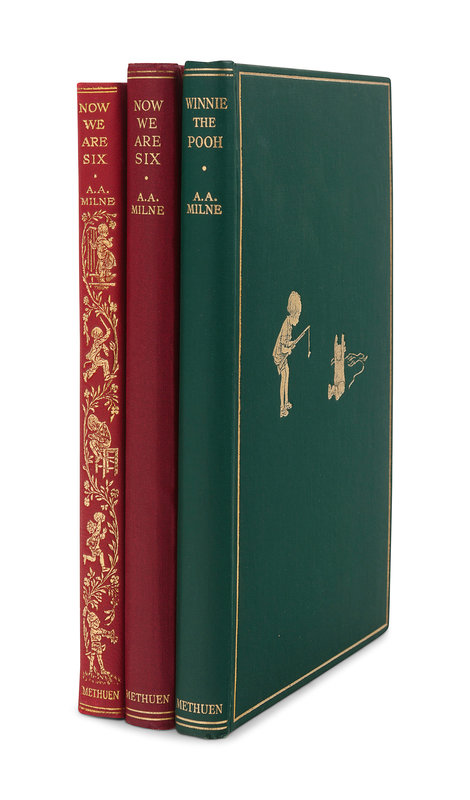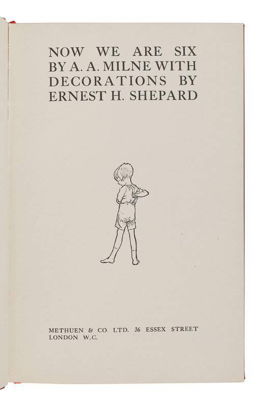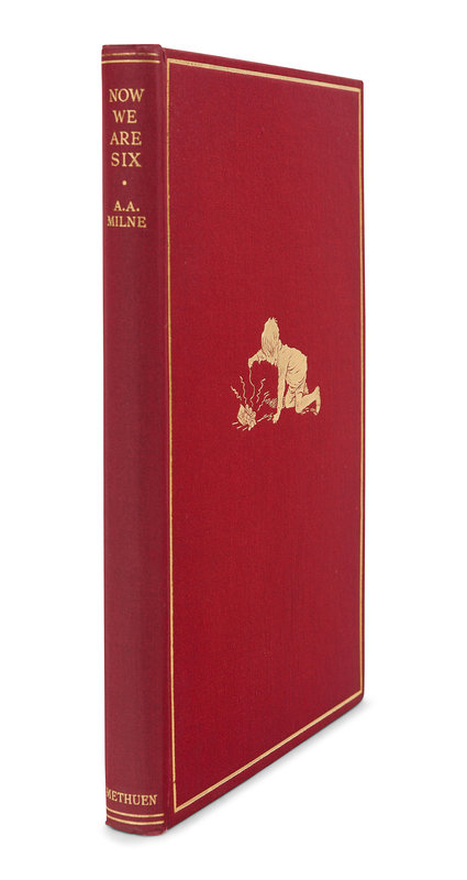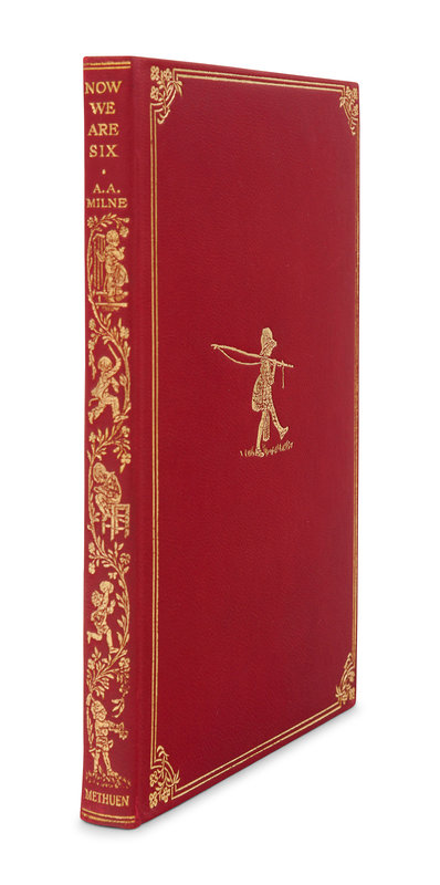 MILNE, Alan Alexander. Now We Are Six. London: Methuen & Co. Ltd, 1927. 8vo. Half-title; numerous illustrations by Ernest H. Shepard. Publisher’s gilt decorated red leather, edges gilt, pink pictorial endpapers; quarter morocco gilt slipcase. Provenance: Bobby Harris (bookplate). FIRST EDITION DELUXE ISSUE of the third title of Milne's adventures of Christopher Robin and Winnie-the-Pooh. From the total deluxe edition of 50,000 copies, the Ship Binding Company bound 5,000 in leather with 2,000 in the present red, and the remaining 3,000 equally divided between blue and green leather.