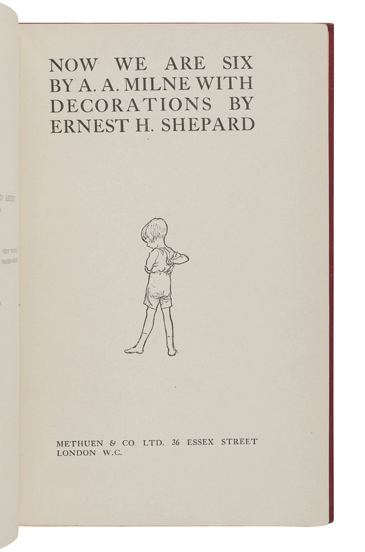 MILNE, Alan Alexander. Now We Are Six. London: Methuen & Co. Ltd, 1927. 8vo. Half-title; numerous illustrations by Ernest H. Shepard. Publisher's burgundy gilt-stamped cloth, top edge gilt, pink pictorial endpapers; quarter burgundy morocco gilt slipcase, chemise (a touch of wear to spine ends). FIRST TRADE EDITION.