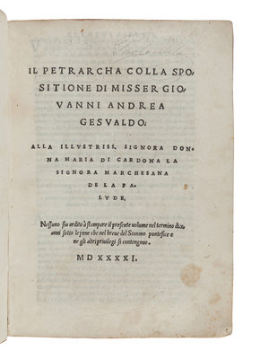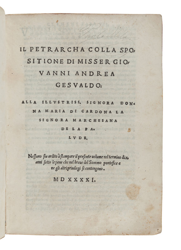 Presumed second Gesualdo edition, first published in 1533. An early edition with Gesualdo's popular commentaries, divided into two parts: I Sonetti e le Canzoni, and I Sonetti e le Canzoni... in Morte di Madonna Lavra. Adams P-807; BMC Italian 504; Graesse V:226.