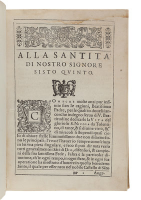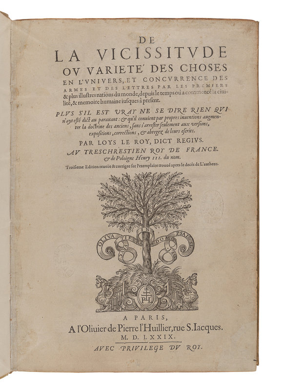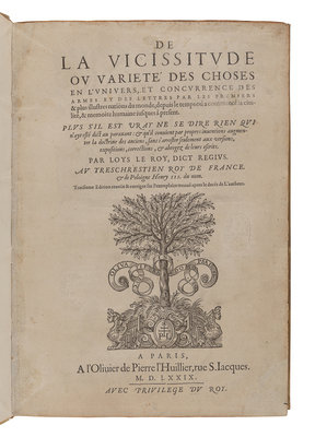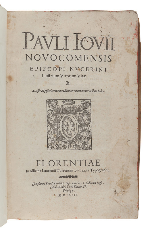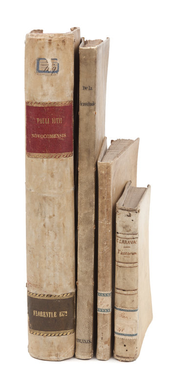 [With:] JOVIUS, Paulus (1483-1552). Pauli Iovii novocomensis episcopi Nucerini Illustrium vivorum vitae. Florence: Laurentii Torrentini Ducalis Typographi, 1572. Folio. Engraved Contemporary limp vellum (endpapers renewed). Later edition. Not in Adams. -- LEROY, Louis (Regius). De la Vicissitude et variete de choses en l'univers… Paris: L'Huillier, 1579. Folio. Contemporary vellum (endpapers renewed). Later edition. Not in Adams. -- FRIGERIO, Ambrogio (1537-1598). Vita gloriosissima et miracoli ecclesi del Beato Confessore Santo Nicola di Tolentino. Ferrara: Vittorio Baldini, 1588. 4to. (Lacking first leaf: title-page recto/woodcut verso, provided in manuscript facsimile; lacking final 8 leaves comprising index). Contemporary vellum gilt (hinges repaired). Second edition. -- Together, 4 works in 4 volumes, condition generally good.