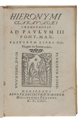 CLARAVACEO, Girolamo. Hieronymi Claravacaei Cremonensis ad Paulum III Pont. Max. Fastorum libri XII. Milan: Franciscum & Simonem Moschenios Fratres, 1554. 8vo. Woodcut device on title-page. Contemporary vellum (text block detached).