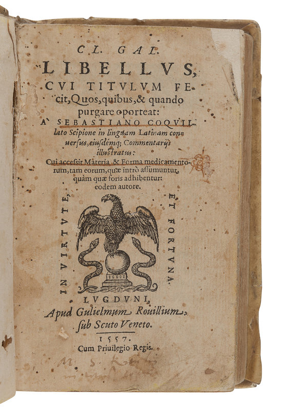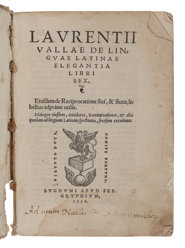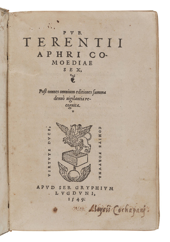 VALLA, Laurentius. Laurentii Vallae de Linguae Latinae Elegantia… Lyon: Sebastian Gryphius, 1538. 8vo. Woodcut devices. Contemporary vellum (worming). Not in Adams. -- TERENTIUS AFER, Publius (185-159 B.C.). Comoediae… Lyon: Sebastian Gryphius, 1549. 12mo. Woodcut device. Later marbled paper-backed boards. Provenance: D. Giuseppe Tosi (letterpress bookplate). Not in Adams. -- GALIENUS, Claudius. Cl. Gal. Libellus cui titulum fecit: Quos, quibus et quando purgare oporteat, a Sebastiano Coquillato Scipione in linguam latinam conversus ejusdemque commentariis illustratus. Lyon: Gulielmum Rouillium, 1557. 12mo. Woodcut device. Contemporary vellum (hinges starting). Not in Adams. -- Together, 3 works in 3 volumes, condition generally good.