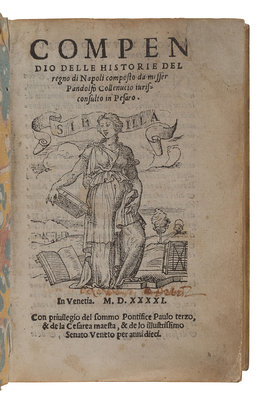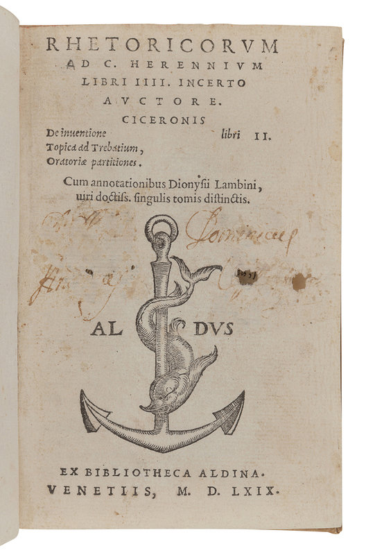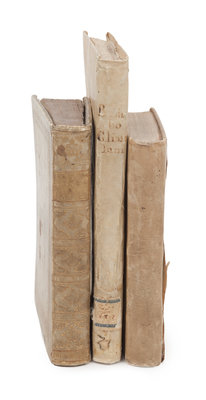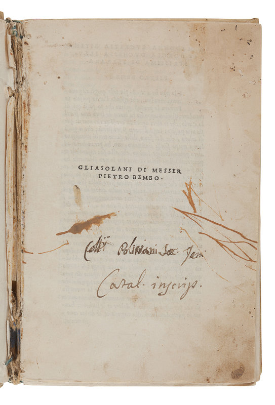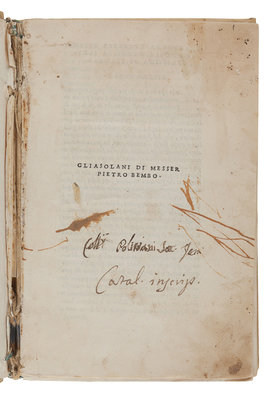 BEMBO, Pietro (1470-1547). Gli asolani.... Venice: Aldus, 1505. Woodcut devices. (Lacking 4 leaves: c1, i2, n1, and n2 [blank].) Contemporary vellum (a few gatherings becoming disbound). Provenance: Ownership inscription on first leaf ("Coll. Polinani? Soc. Jesu"). FIRST EDITION, FIRST ISSUE, with the dedication to Lucrezia Borgia, dated August 1504, on a1v-a2r, which was removed for the second issue. -- COLLENUCCIO, Pandolfo (1444-1541). Compendio delle historie del Regno di Napoli. Venice: Michele Tramezino, July 1541. 8vo. Woodcut device. (Upper corner repaired two leaves touching text.) Contemporary vellum gilt. Not in Adams. -- CICERO, Marcus Tullius (106-43 B.C.). Rhetoricorum ad C. Herennium libri IV, and other works. Venice: Ex Bibliotheca Aldina, 1569. Comprising ff. 184 only (lacking 34 leaves). Later vellum. See Adams C-1689. -- Together, 3 works in 3 volumes, condition generally good.