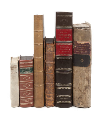SANDYS, George (1578-1644). A Relation of a Journey... London: for Andrew Crooke, 1637. Folio. Engraved title, engraved vignettes. Modern calf. Fourth edition. -- MILTON, John (1608-1674). Pro populo Anglicano defensio contra Claudii Anonymi, alias Salmasii, defensionem regiam. London [i.e., Utrecht]: Gardianis, 1652. 12mo. Woodcut device and headpieces. Contemporary vellum. Provenance: Alexander Gruntt (armorial bookplate). -- EUSEBIUS OF CAESAREA. The Ancient Ecclesiastical Histories of the First Six Hundred Years after Christ. London: Abraham Miller, 1663. Folio. (First few leaves bound in on stubs.) Modern calf. -- ERASMUS, Desiderius (1466?-1536). Adagiorum Epitome. Editio Novissima, cum triplici indice. Oxford: W. Hall, 1666. 12mo. Title-page printed in red and black (laid down with small losses touching letters). Modern calf. -- BATES, William (1625-1699). Vitae selectorum aliquot virorum... London: A. G. & J. P., 1681. 4to. Contemporary vellum. -- CATULLUS, Caius Valerius (84?-54 B.C.). Observationes. London: Isaacum Littleburii, 1684. 4to. Title printed in red and black. Contemporary English panelled calf, "Newby Hall" gilt-lettered vertically on upper cover along spine (covers detached). Provenance: Newby Hall (binding). -- Together 6 works in 6 volumes, condition generally good.