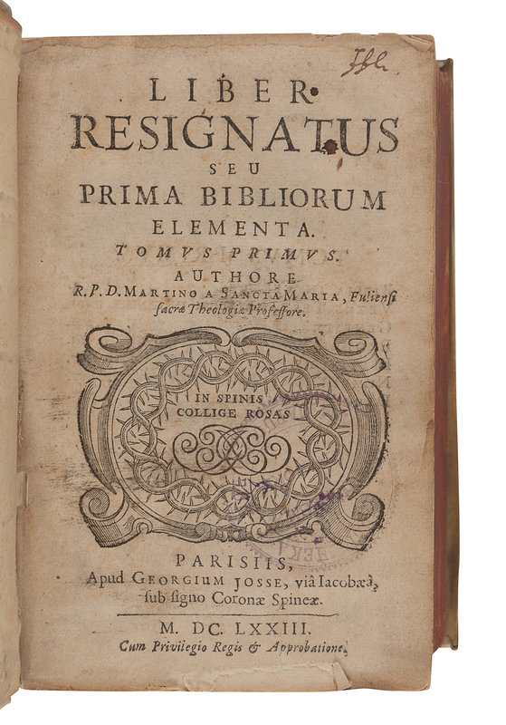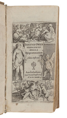 OWEN, John (ca 1564-ca 1622/1628). Epigrammatum. Amsterdam: Ioanne Ianssonium, 1634. 16mo. Engraved title. Contemporary vellum. -- LUDOVICUS, John. Passer Solitarius hoc est Vita & functiones Animae contemplativae… Munich: Adam Berg, 1634. [Bound with:] Trihebdomadale Animae per Hujus Vitae Desertum ad Aeternitatem proficiscentis. Munich: Adam Berg, 1634. Engraved title to first work, woodcut devices. (Last leaf of second work supplied in manuscript facsimile.) 2 works in one volume, 12mo. Contemporary pigskin decorated in blind (lacking one clasp). -- PILIUS, Martinus. M. Pilii...de amtitione liber, et alia ejus poemata. The Hague: Theodore Maire, 1641. 12mo. Woodcut device. Contemporary vellum. Provenance: Lycee Louis Le Grand, Paris (stamps). -- SENECA, Lucius Annaeus (ca 3 B.C.-65 A.D.). Opera omnia. Lyon: Elzevir, 1649. Volume one (of 4) only, 12mo. Engraved title-page and plates. Later calf (spine perished). -- PETAU, Denis (1583-1652). Rationarium temporum in partes duas, libras tredecim tributum… Paris: Sebastian Cramoisy, 1652. 12mo. Contemporary vellum (hinges starting). -- MARTINUS DE SANCTA MARIA. Liber Resignatur, seu prima Bibliorum Elementa. Paris: Josse, 1673. 2 volumes in one, 8vo. Engraved headpieces, woodcut initials. Contemporary vellum (upper hinge separated). -- FRONTINUS. Strategematicon sive de solertibus ducum factis & dictis libri IV. S. Tennulius… Lyon and Amsterdam: A. & A. Gaesbeeck, 1675. 12mo. Engraved title; woodcut devices. Contemporary vellum. -- Together, 8 works in 7 volumes, condition generally good.