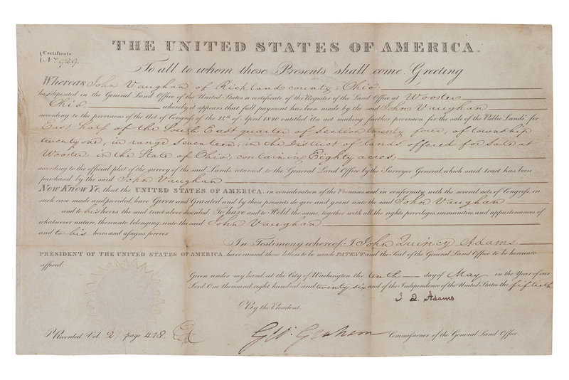 1 page, on vellum, accomplished in manuscript, paper seal, docketed verso. Land grant for 80 acres in Wooster, Ohio for John Vaughn.