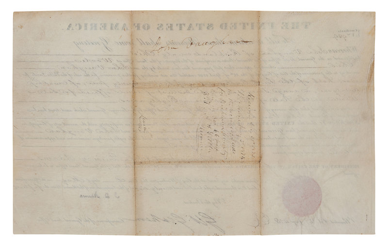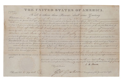 ADAMS, John Quincy (1767-1848). Engraved document signed as President (“J. Q. Adams”), countersigned by Commissioner of the General Land Office George Graham, 10 May 1826.