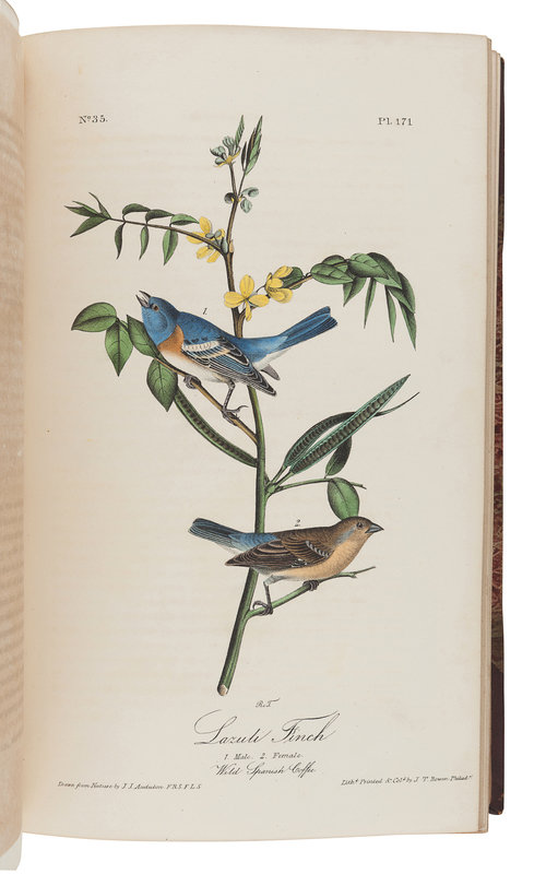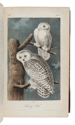 FIRST OCTAVO EDITION. Audubon’s double-elephant folio edition of The Birds of America (1827-1838) established his reputation as the greatest ornithological artist of his time. Though that edition was published in London to ensure the quality of the plates, he employed the Philadelphia firm of J. T. Bowen to produce this more commercially viable edition under the close supervision of his sons. The original subscription price was $100, and its commercial success granted Audubon financial security. To the original plate count included in the double-elephant folio edition, the octavo edition adds 65 new images for a total of 500 plates, making it "the most extensive color plate book produced in America up to that time" (Reese). Ayer/Zimmer, p.22; Bennett, p.5; McGill/Wood, p.208; Nissen IVB 51; Reese 34; Sabin 2364.