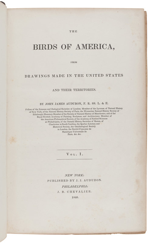 AUDUBON, John James (1785-1851). The Birds of America, from Drawings Made in the United States and their Territories. New York: J.J. Audubon; Philadelphia: J.B. Chevalier, [1839-] 1840-1844.