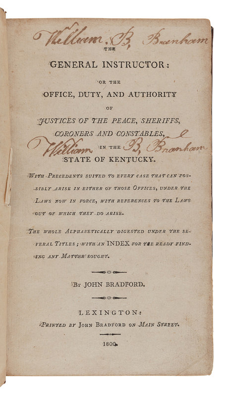 BRADFORD, John (1749-1830). A General Instructor: or the Office, Duty, and Authority of Justices of the Peace, Sheriffs, Coroners, and Constables, in the State of Kentucky. Lexington, KY: John Bradford, 1800.