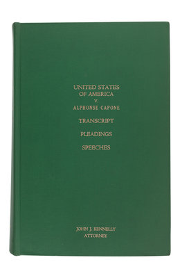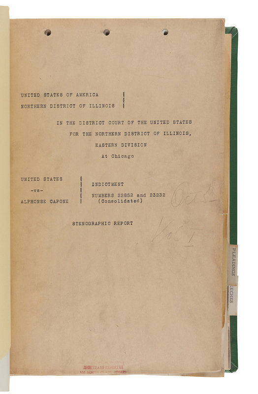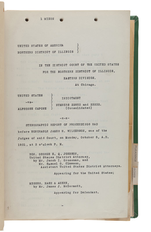 Comprising carbon copy typescripts of proceedings before Honorable James H. Wilkerson in 1931 on: Monday, October 5 (48pp.); Tuesday, October 6 (86pp.); Saturday, October 24 (25pp.); Thursday, October 15 (78pp.); Thursday, October 15 (119pp.); Saturday, October 10 (77pp.). Also with carbon copy typescript "Additional Assignment of Errors" (3pp.), carbon copy typescript of proceedings to settle a bill of exceptions, Tuesday, December 1, 1931, at 10am (7pp.), and with 57pp. mimeographed briefs and documents for the indictment including the jury decision. With heavy card cover sheets, duplicated by A. M. Hanson, Shorthand Reporter, 155 North Clark Street [Chicago]; all library bound in green cloth. Provenance: John J. Kennelly, Attorney (gilt lettering on cover).