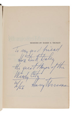 FIRST EDITION, PRESENTATION COPY, INSCRIBED BY TRUMAN TO DALEY: "To my good friend Hon. Dick Daley the great Mayor of the Windy City 10/6/56 Harry Truman." Daley cast his vote for Truman as a delegate at the 1948 Democratic National Convention; he named the newest campus of the City Colleges of Chicago "Harry S. Truman College" in 1976.
