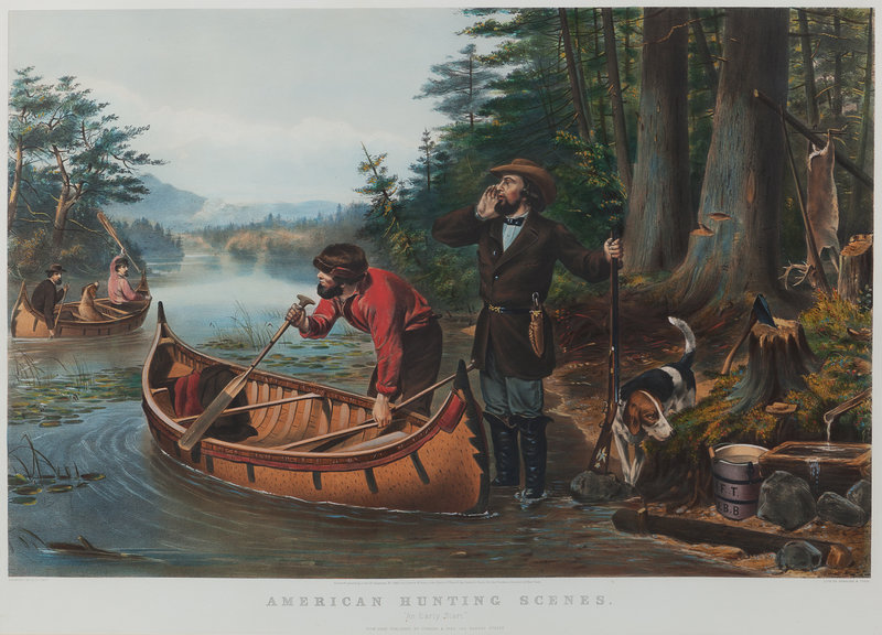 American Hunting Scenes: "An Early Start." 1863. (G.0187). Large format lithograph with hand-coloring, sheet 24 3/4 x 32 in. A few tiny marginal spots, some minor soiling to verso, a few pencil annotations verso, matted and framed.