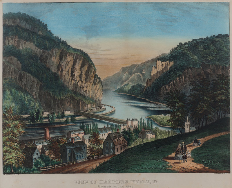 View of Harpers Ferry, VA (From the Potomac Side). Ca 1860. Medium format lithograph with hand coloring heightened in gum arabic, sheet 21 3/4 x 18 in. Some mostly marginal spotting or staining, some browning, heavier verso.