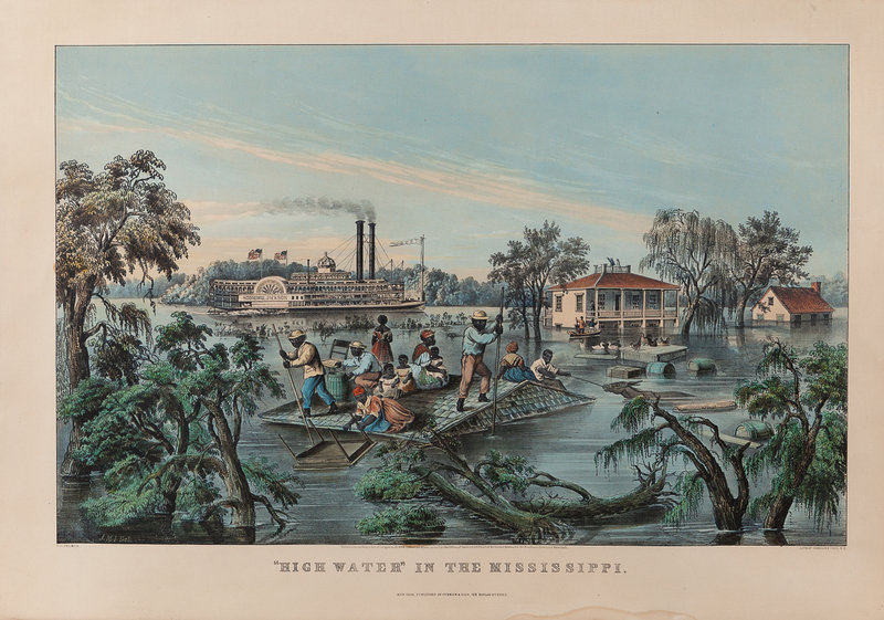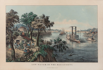 "High Water" in the Mississippi. 1868. (G.3057). -- "Low Water" in the Mississippi. 1868. (G.4150). -- 2 lithographs with hand coloring, large format, visible area approximately 32 x 23, some browning, spotting or toning, matted and framed. (Please note that these are later restrikes printed on thinner paper.)
