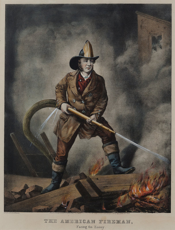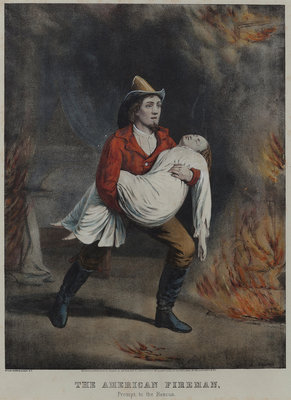 The American Fireman: Facing the Enemy. 1858. (G.0166). -- The American Fireman: Prompt to the Rescue. 1858. (G.0167). -- 2 lithographs with hand coloring, medium format, visible area approximately 19 x 14 1/4 in., some browning, spotting or toning, matted and framed (unexamined out of frame).