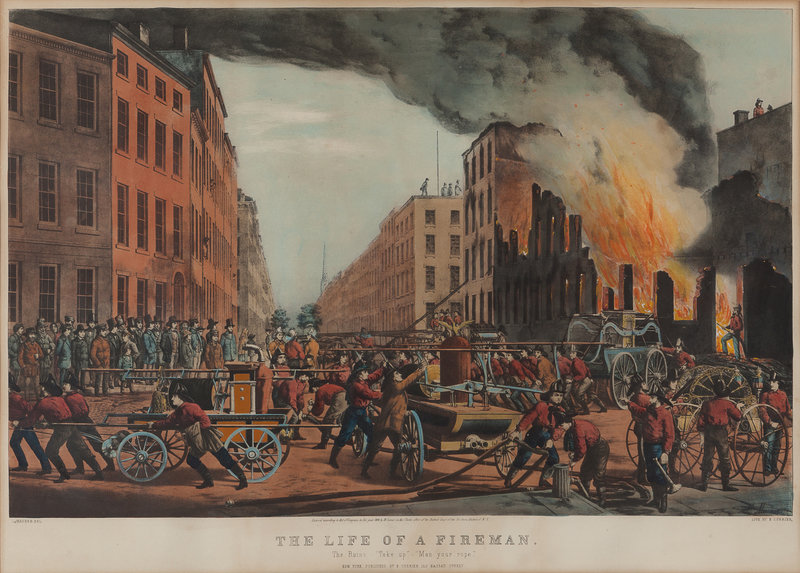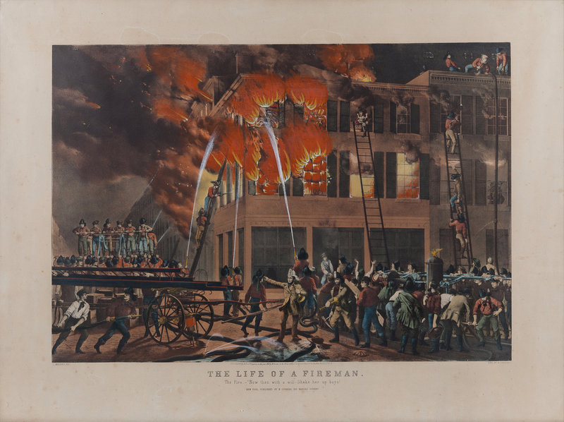 The Life of a Fireman: The Fire. – “Now Then with a Will - Shake Her Up, Boys!''. (G.3783). -- The Life of a Fireman: The Ruins – “Take Up'' – “Man Your Rope'' (G.3788). -- 2 lithographs with hand coloring, large format, visible area approximately 19 x 26 1/2 in. or larger, some browning, spotting or toning, matted and framed (unexamined out of frame).