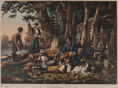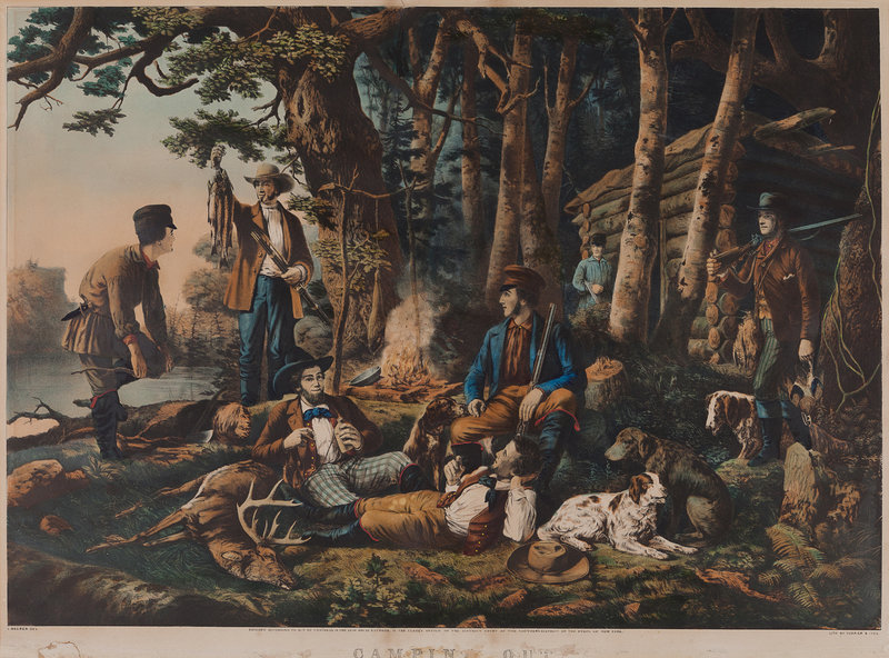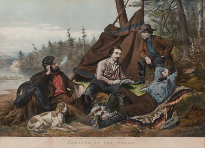 Louis Maurer, after. Camping Out: ["Some of the Right Sort"]. 1856. (G.0867). Trimmed with loss of portion of caption, surface abrasions affecting the caption. -- Arthur F. Tait, after. Camping in the Woods: "Laying Off". 1863. (G.0865). -- 2 lithographs with hand coloring, large format, visible area approximately 20 x 27 in. or larger, some browning, spotting or toning, matted and framed (unexamined out of frame).