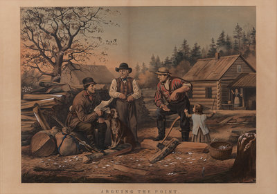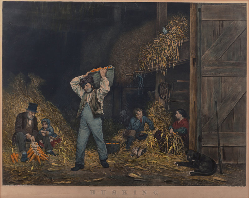 Arthur F. Tait, after. Arguing the Point. 1855. (G.0287). -- Eastman Johnson, after. Husking. 1861. (G.3249). -- 2 lithographs with hand coloring, large format, visible area approximately 20 1/2 x 28 in. or larger, some browning, spotting or toning, matted and framed (unexamined out of frame).