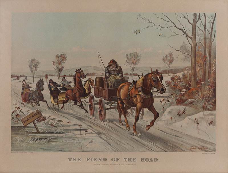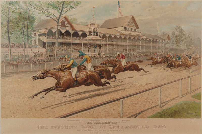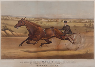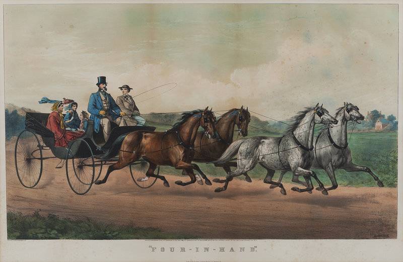 Louis Maurer, after. "Four-in-Hand". 1861. (G.2271). -- Scott Leighton, after. The Queen of the Turf Maud S, Driven by W. W. Bair... 1880. (G.5440). -- Scott Leighton, after. The Fiend of the Road. 1881. (G.2113). -- Louis Maurer, after. The Futurity Race at Sheepshead Bay: Sept. 03, 1888... 1889. (G.2392). -- 4 lithographs with hand coloring, large format, visible area approximately 19 3/4 x 27 in. or larger, some browning, spotting or toning, matted and framed (unexamined out of frame).