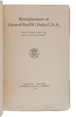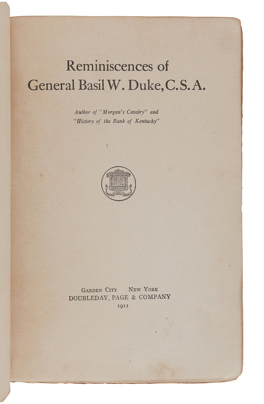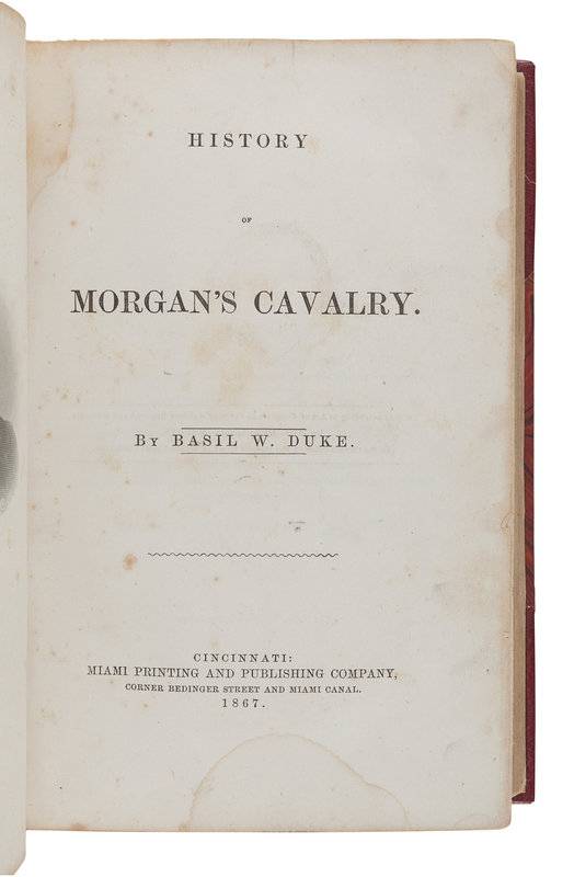 History of Morgan's Cavalry. Cincinnati: Miami Printing and Publishing Co., 1867. Provenance: James Brennan, member of Co. E in the Kentucky 2nd Infantry (inscription). -- Morgan's Cavalry. New York and Washington: Neale Publishing Company, 1906. -- Reminiscences of General Basil W. Duke, C.S.A. Garden City and New York: Doubleday, Page & Company, 1911. -- Together, 3 works in 3 volumes, all first edition, 8vo, uniformly bound in 20th-century half red morocco with marbled boards, spines in 6 compartments with 5 raised bands gilt, all in very fine condition.
