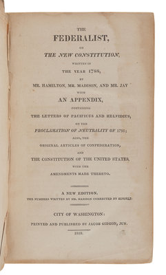 [THE FEDERALIST PAPERS]. -- HAMILTON, Alexander (1739-1802), James MADISON (1751-1836) and John JAY (1745-1829). The Federalist, on the New Constitution...A New Edition. City of Washington: Jacob Gideon, 1818.