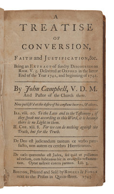 [GREAT AWAKENING]. CAMPBELL, John (1691-1761). A Treatise of Conversion, Faith, and Justification... Boston: Rogers & Fowle, 1743.