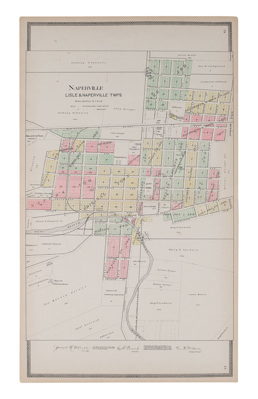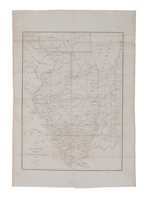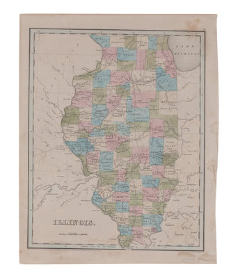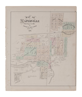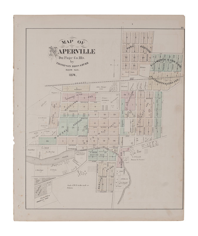BURR, David. Map of Illinois with parts of Indiana, Ouisconsin, &c. N.p., 1836. Engraved map. -- BRADFORD, T.G. Illinois. Boston, 1838. Engraved map with hand coloring. -- Thompson Brothers & Burr. Map of Naperville, DuPage County, Illinois. N.p., 1874. Engraved map with hand coloring. -- Naperville: Lisle & Naperville Townships. N.p., n.d. Engraved map with hand coloring.