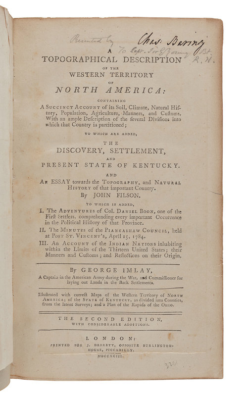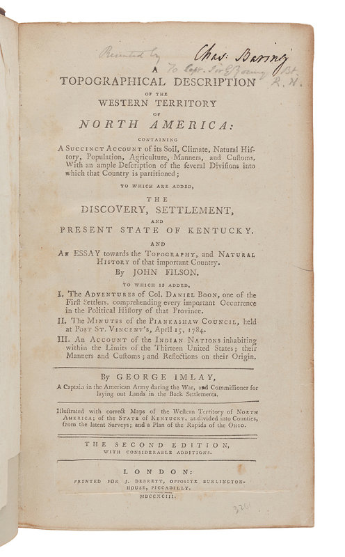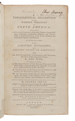 Second edition of Imlay's account of western expansion; expanded by the addition of John Filson's The Discovery, Settlement, and Present State of Kentucky (see lot 289), continually paginated comprising pp.269-415. With the author's name on the title-page erroneously listed as "George" instead of Gilbert. Bradford 2572; ESTC T51472; Howes I-12; Sabin 34355