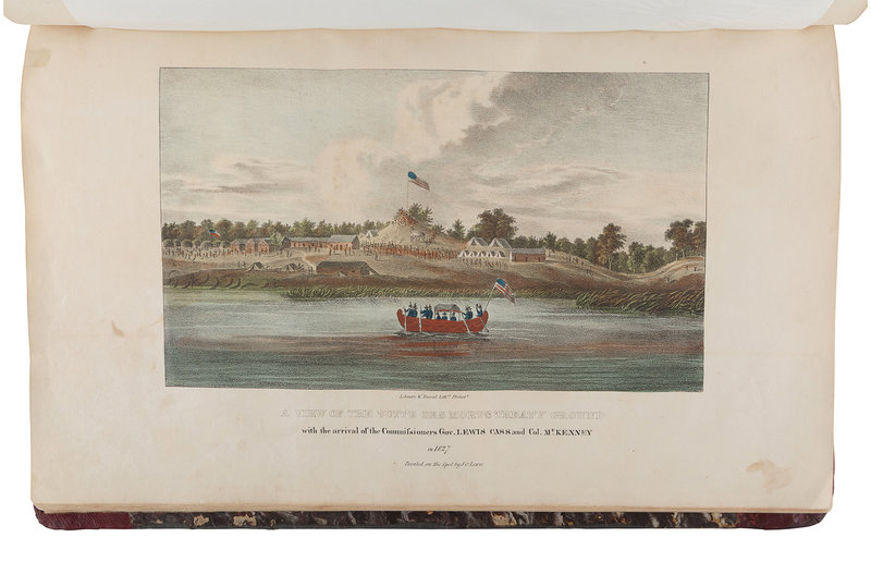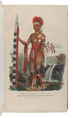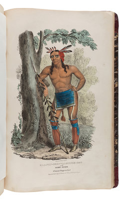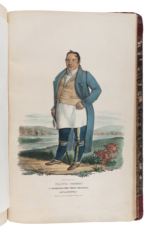 FIRST EDITION recording the dress of the Potawatomi, Winnebago, Shawnee, Sioux, Miami, Fox, Iowa and other tribes at treaties of Prairie du Chien, Fort Wayne, Fond du Lac and Green Bay, scarcer than Catlin's North American Indian Portfolio, Maximilian's Reise in das Innere von Nord-America or McKenney and Hall's History of the Indian Tribes. Publication was costly, and the work was intended to be issued in 10 parts each comprising 8 plates issued in printed wrappers. The publisher's bankruptcy during the printing of part 9 caused the edition to be reduced; part 10 was barely finished and sparsely distributed. An 11th part would have contained "Historical and Biographical Description of the Indians," but it was never published. The title (not present here) and three advertisement leaves complete the only text in the work, excluding text on the wrappers. Copies are most commonly found with 72 plates, rarely with 77, and very occasionally with 80. Field 936; Howes L-315; Reese Stamped with a National Character 23; Sabin 40812.