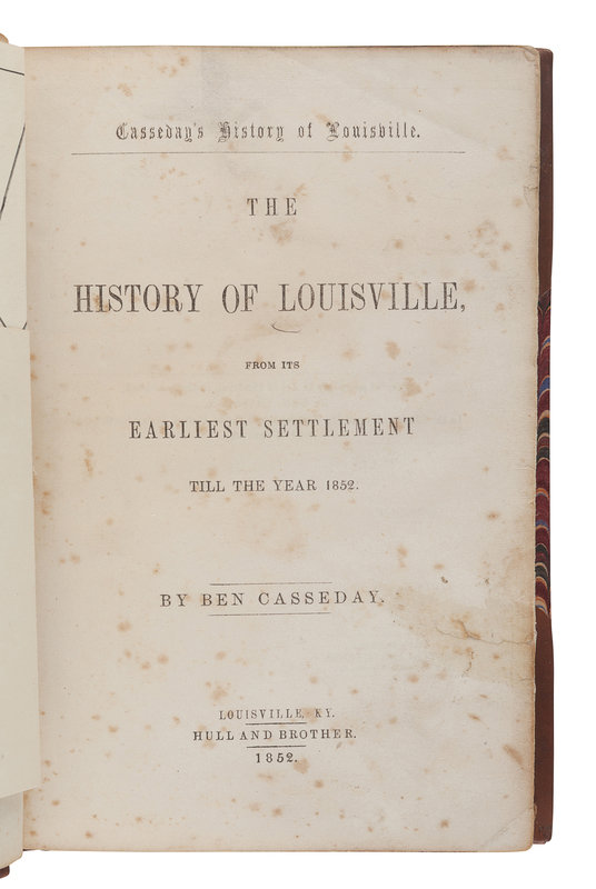 BUTLER, Mann. A History of the Commonwealth of Kentucky. Louisville: Wilcox, Dickerman & Company, 1834. 20th-century green leather. -- COLLINS, Richard. Historical Sketches of Kentucky. Maysville, KY and Cincinnati: Lewis Collins and J.A. & U.P. James, 1847. 20th-century calf gilt. -- CASSEDAY, Ben. The History of Louisville. Louisville: Hull and Brother, 1852. 20th-century quarter calf with marbled boards. -- MUTZENBERG, Charles. Kentucky's Famous Feuds and Tragedies. New York: R.F. Fenno & Company, 1917. Original printed maroon cloth. -- And 4 others. Together 8 works in 10 volumes, 8vo, condition generally fine.