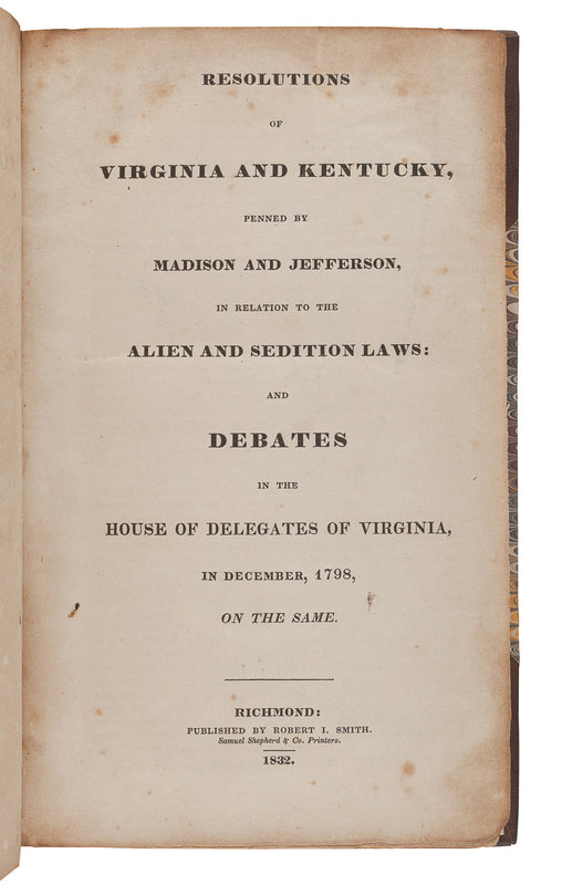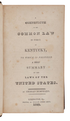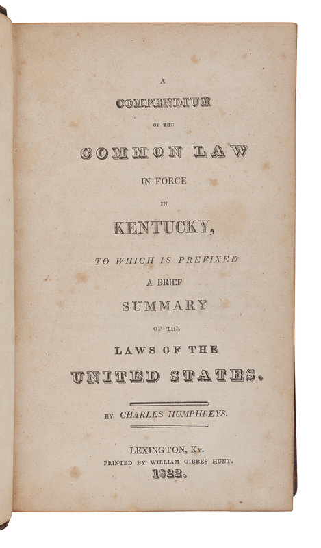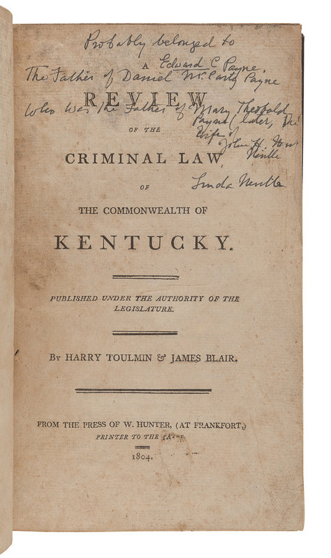 MADISON, James and Thomas JEFFERSON. Resolutions of Virginia and Kentucky Penned by Madison and Jefferson in Relation to the Sedition Laws. Richmond: Robert I. Smith, 1832. 20th-century quarter calf with marbled boards. Provenance: Eugene Casserly (bookplate). Howes V-122; Sabin 43720. -- BATES, Daniel. Life and Trial of Dr. Abner Baker, Jr. Louisville: Prentice and Weissinger, 1846. 20th-century quarter calf with marbled boards. -- HUMPHREYS, Charles. A Compendium of the Common Law in Force in Kentucky. Lexington: William Gibbes Hunt, 1822. Contemporary tooled leather. -- TOULMIN, Harry and James BLAIR. Review of the Criminal Law of the Commonwealth of Kentucky. Frankfort: W. Hunter, 1804. 20th-century brown calf. -- Together, 4 works in 4 volumes, all first edition, 8vo, condition generally good.