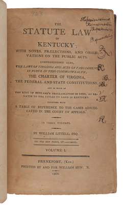 LITTELL, Charles (1768-1824). The Statute Law of Kentucky. Frankfort: William Hunter, 1809, 1810, 1814.