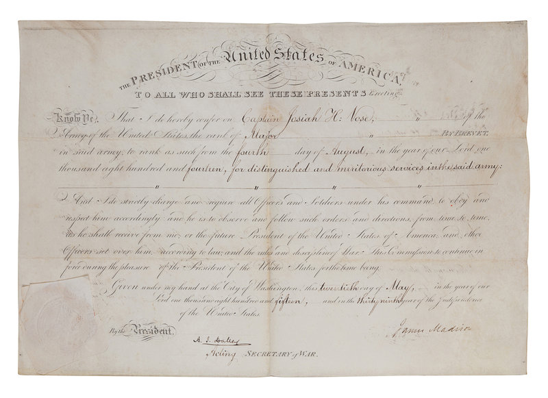 MADISON, James (1751-1836). Engraved document signed as President (“James Madison”), countersigned by A. J. Dallas, acting Secretary of War, 20 May 1815.