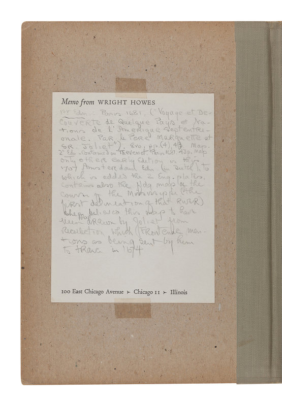 8vo (178 x 112 mm). Engraved title page vignette by J. Goeree, engraved folding map “Land en Volk-ontdekking in’t Noorder ge deelte van America, door P. Marquette en Joliet”; 2 folding engraved plates. (Small wormtrack to gutter margins, stab holes from old binding in gutter margin, minor chipping with loss to lower corner of title-page). 19th-century wrappers, waste leaves from an 1867 collection of German poetry (chipping with losses); board folding case. Provenance: Chicago Historical Society (perforated stamp and manuscript annotations, withdrawn September 1948); Wright Howes (1882-1978), Chicago bookseller and bibliographer (pencil-written note about the first edition of the present work on personal memo sheet).