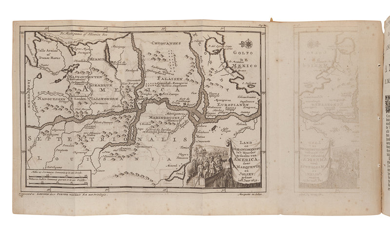FIRST EDITION IN DUTCH, BY THE CO-DISCOVERER OF THE UPPER MISSISSIPPI, a translation of Marquette’s Découverte de quelques pays et nations de l’Amerique septentrionale in Thevenot's Recueil de voyages published Paris,1681. The publisher, Vander Aa, published the present edition in parts and also issued them separately. Marquette first arrived in Quebec in September 1666 and later founded the mission of St. Ignace on the Straits of Mackinac, the first settlement in Michigan. In 1673, he joined Louis Jolliet's expedition in search of an overland route to the Mississippi River, during which they became the first Europeans to explore the Upper Mississippi, travelling as far south as the mouth of the Arkansas River. On their return, they travelled back to the mouth of the Illinois River and reached Lake Michigan near the site of present-day Chicago by way of the Chicago Portage. Alden & Landis 707/102; Sabin 44666n.