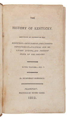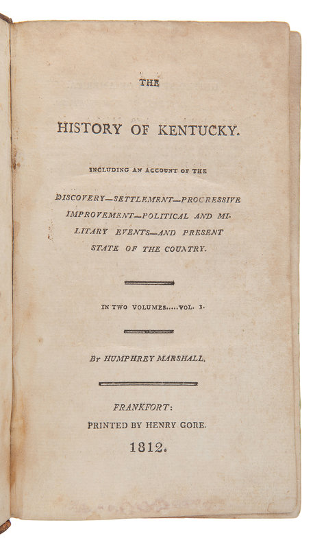 MARSHALL, Humphrey (1760-1841). The History of Kentucky. Frankfort: Henry Gore, 1812.