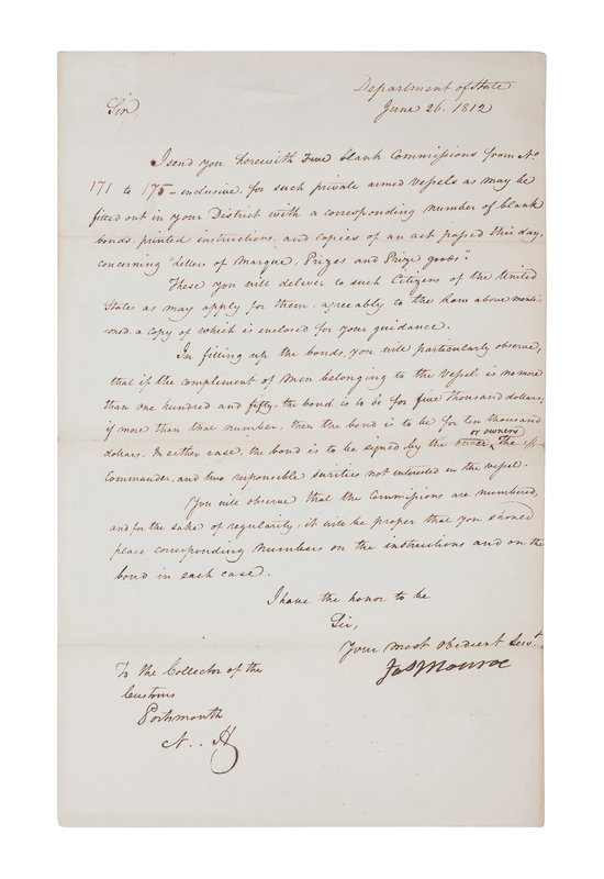 MONROE, James. Letter signed as Secretary of State (“Jas Monroe”), to the Collector of the Customs, Portsmouth, New Hampshire. Washington D. C., 26 June 1812.