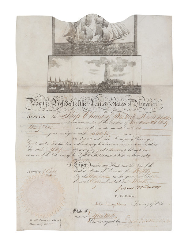 1 page, on vellum, 4to, 367 x 265 mm, accomplished in manuscript with scalloped edge at top, paper seal, docketed verso, creased from folding, some minor browning, "M" of "Monroe" affected slightly by one fold. Ship’s passport for the Ship China of New York, with David Whittier as Captain, to pass "without any hindrance seisure or molestation."