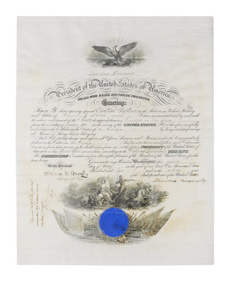 1 page, on vellum, accomplished in manuscript, paper seal, signature slightly smudged. Military appointment of Charles B. Hatch, Junior as Ensign in the Navy.