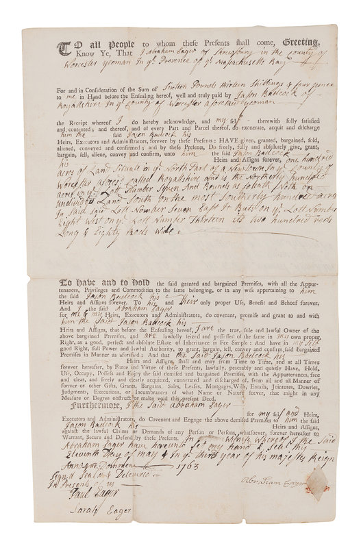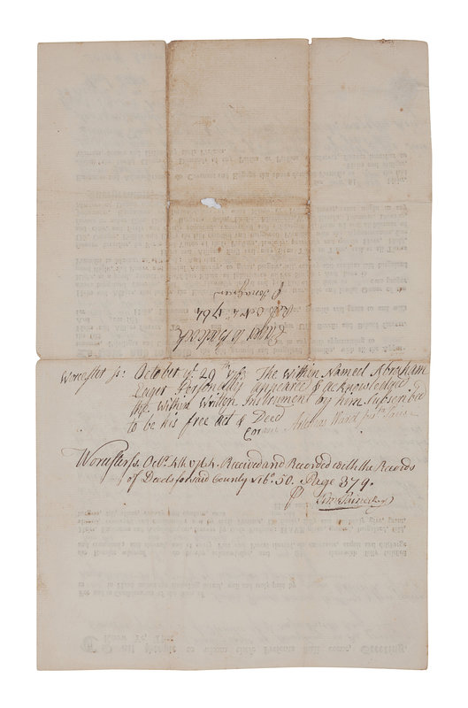 SIGNED BY WARD on verso of a land grant. Ward, a Commander in Chief of the Massachusetts Militia during the 1775 Siege of Boston, was second in command of the Continental Army until his resignation in 1776.