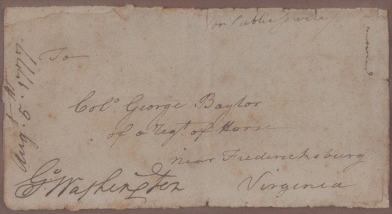 A FINE WASHINGTON FRANKING SIGNATURE on an address panel addressed in a different hand, intended for Colonel George Baylor "of a Regt. of Horses near Fredericksburg Virginia." Baylor served as Washington's first aide-de-camp during the Revolutionary War. He was later appointed to lead the 3rd Regiment of Continental Light Dragoons, which often served as escort for Martha Washington. SIGNED BY WASHINGTON AS DELEGATES BEGAN SIGNING THE DECLARATION OF INDEPENDENCE.
