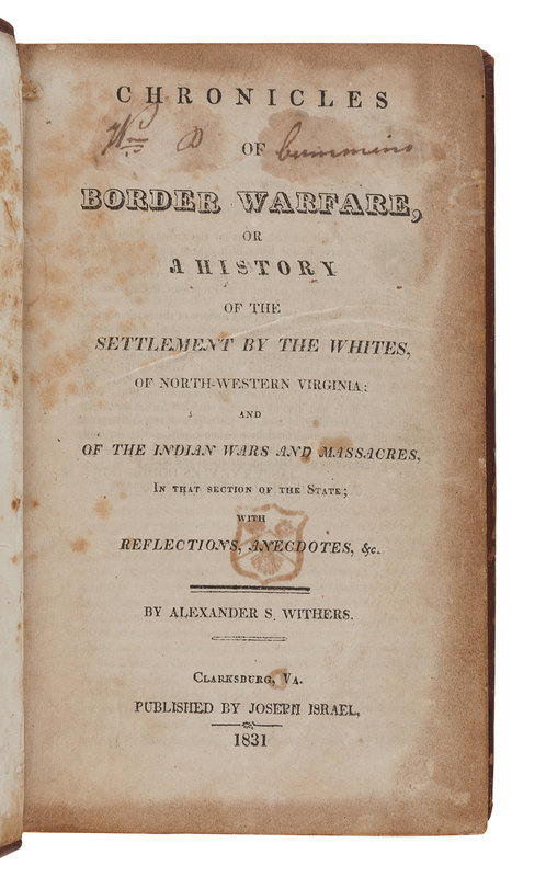 WITHERS, Alexander (1792-1865). Chronicles of Border Warfare. Clarksburg, VA: Joseph Israel, 1831.